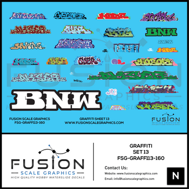 Graffiti decals work great on your freight cars, buildings and many other items across your layout. Our top of the line graffiti decals are printed with a white backing on a clear decal film, this white backing allows the decal to be placed over dark colors (including black). With the ability to print and control where white is printed our decals are not printed on a white decal film.