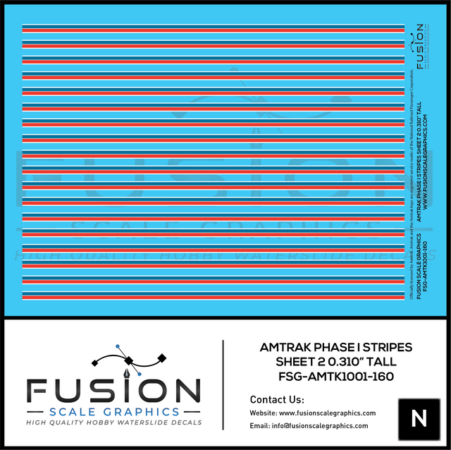 N Scale Amtrak Phase I Stripes Sheet 2 0.310" Tall Decal Set may be made to order and will ship within our normal processing time if its not in stock.