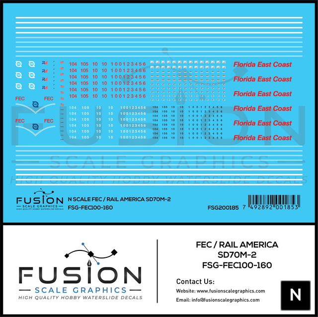 N Scale Florida East Coast/Rail America EMD SD70M-2 Locomotive Decal Set may be made to order and will ship within our normal processing time if its not in stock.