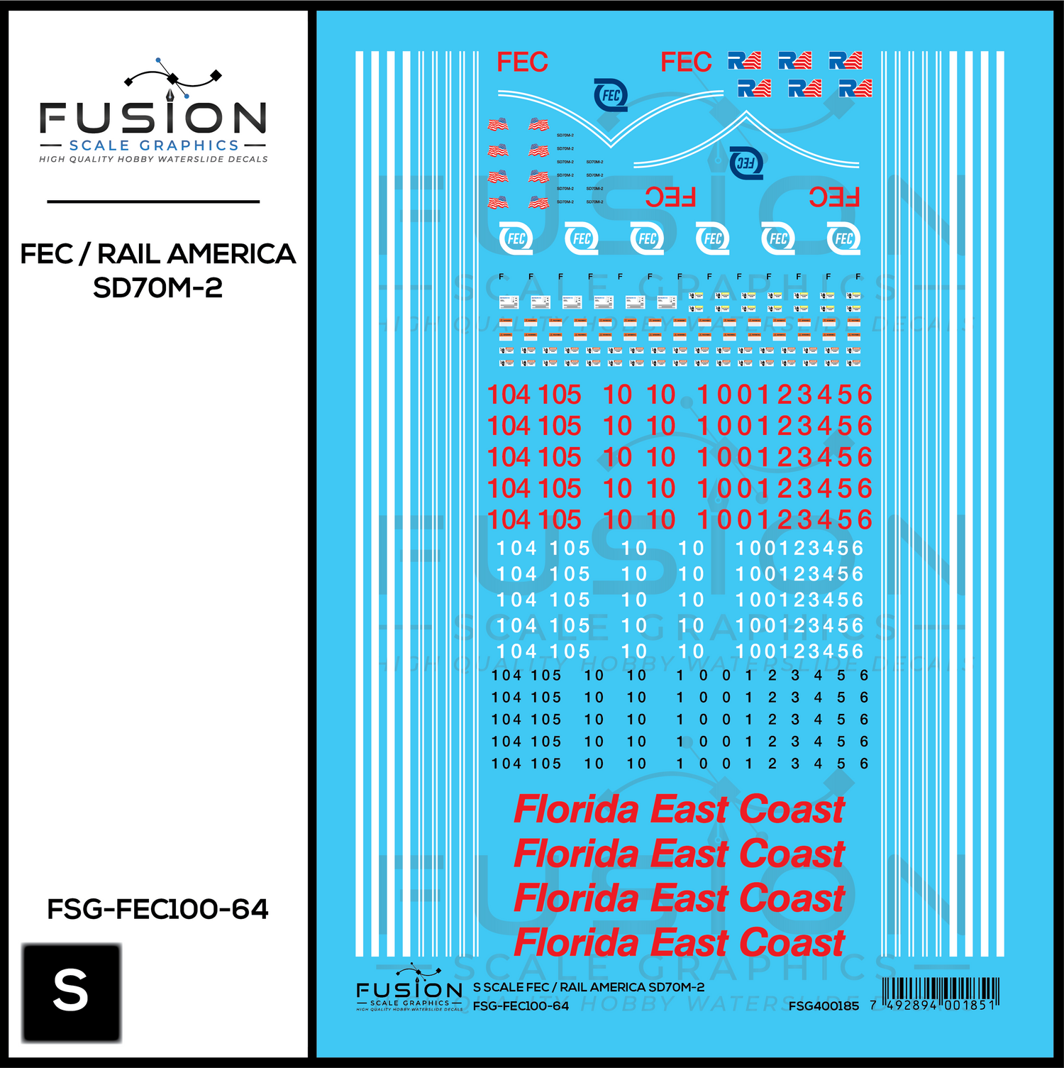 S Scale Florida East Coast/Rail America EMD SD70M-2 Locomotive Decal Set may be made to order and will ship within our normal processing time if its not in stock.