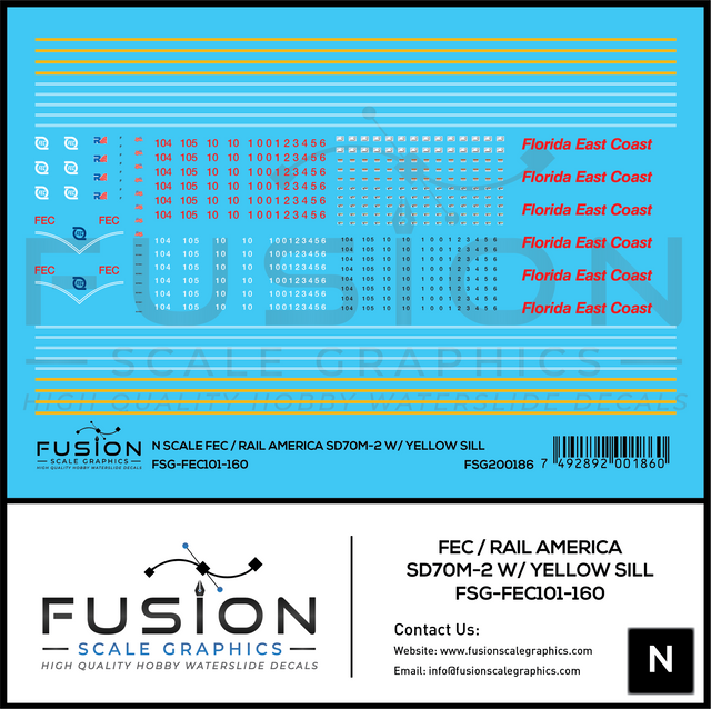 N Scale Florida East Coast/Rail America EMD SD70M-2 W/ Yellow Sill Locomotive Decal Set