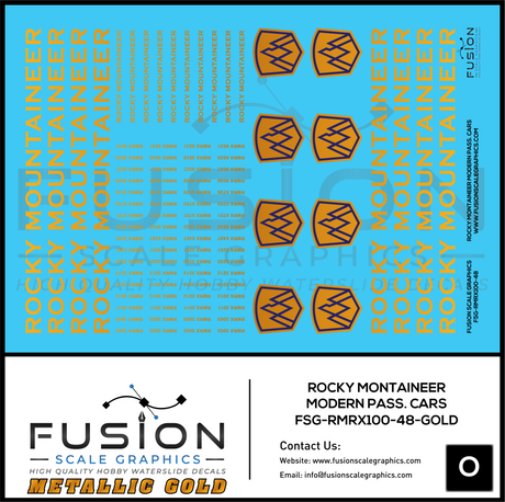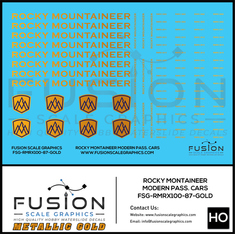 HO Scale Metallic Gold Rocky Mountaineer Passenger Cars Decal Set