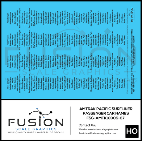 HO Scale Amtrak Pacific Surfliner Passenger Car Names Decal Set