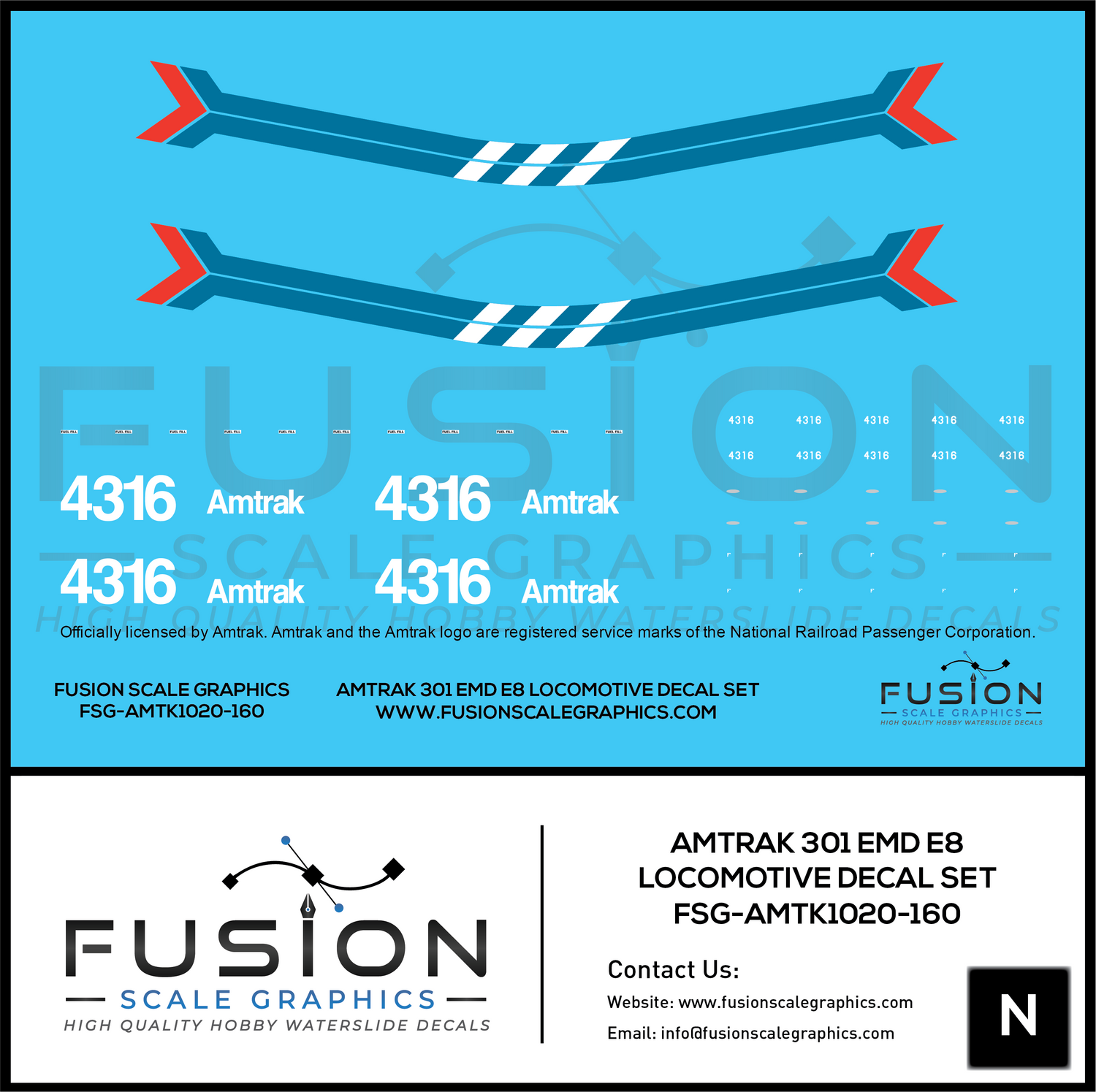 N Scale Amtrak 301 EMD E8 Locomotive Decal Set may be made to order and will ship within our normal processing time if its not in stock.